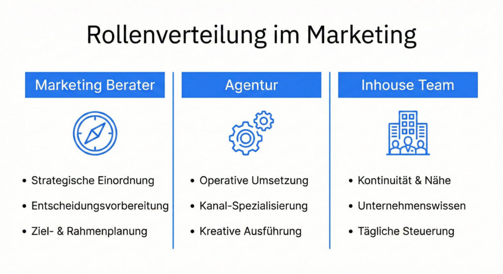 Marketing Berater, Agenturen und interne Teams übernehmen unterschiedliche Rollen. Während Berater strategisch einordnen und Entscheidungen vorbereiten, setzen Agenturen Maßnahmen operativ um. Inhouse Teams sorgen für Kontinuität und Nähe zum Unternehmen, verfügen jedoch häufig nur begrenzte Zeit für strategische Arbeit.