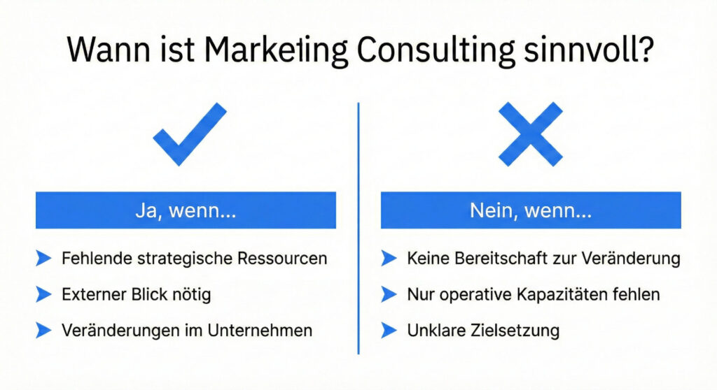 Nicht in jeder Situation ist Marketing Consulting die richtige Lösung. Wenn keine Bereitschaft besteht, bestehende Entscheidungen zu hinterfragen oder Strukturen anzupassen, bleibt Beratung wirkungslos.